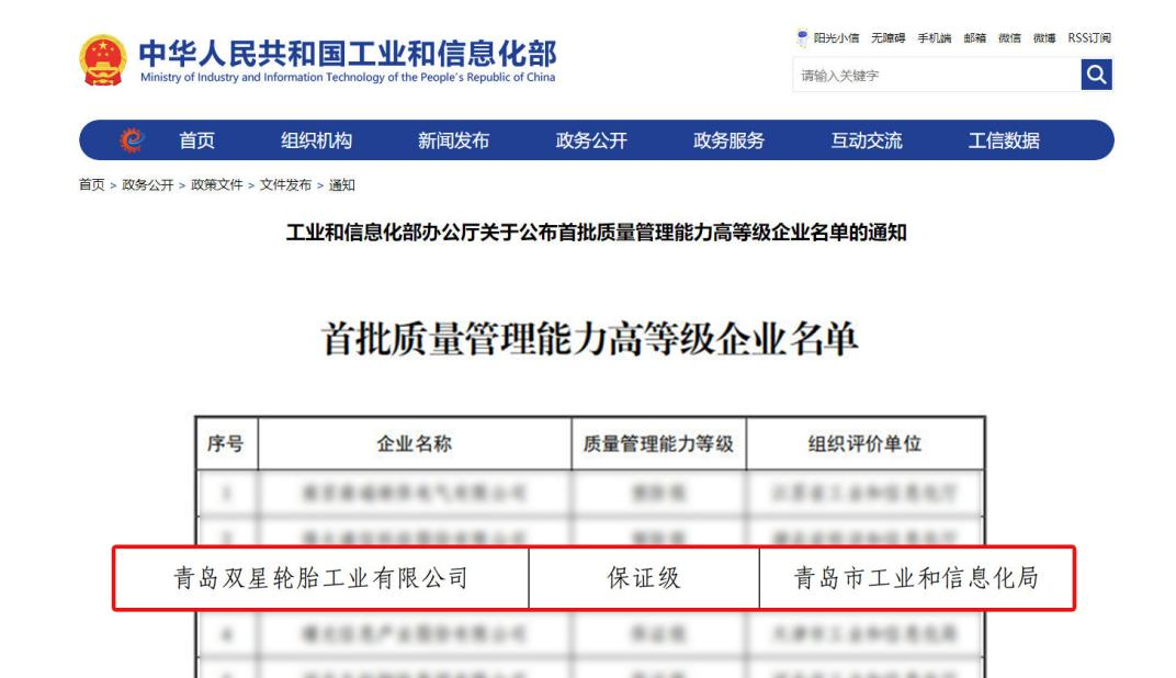 行業唯一!雙星輪胎入選工信部質量管理能力高等級企業名單